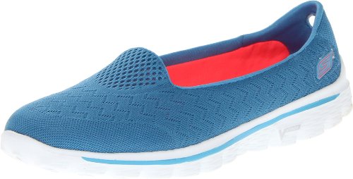 Welcome to the naturally comfortable stride of the Skechers GOwalk 2-Ultimate slip-on walking shoe. This ultra-lightweight women's loafer is crafted with a seamless mesh upper, smooth fabric lining and roomy forefoot for easygoing, barefoot wear. An integrated OrthoLiteTM anti-microbial sockliner helps inhibit odor and prevent slippage, while the shock-absorbing, ResalyteTM midsole cushions every step. A flexible, traction-enhancing sole with GOimpulse sensors allow the Skechers GOwalk 2-Axis skimmer to deliver a more responsive, natural feel for the ground. V-Stride technology features a uniquely angled outsole that complements a natural walking gait and promotes fluid stride transitions